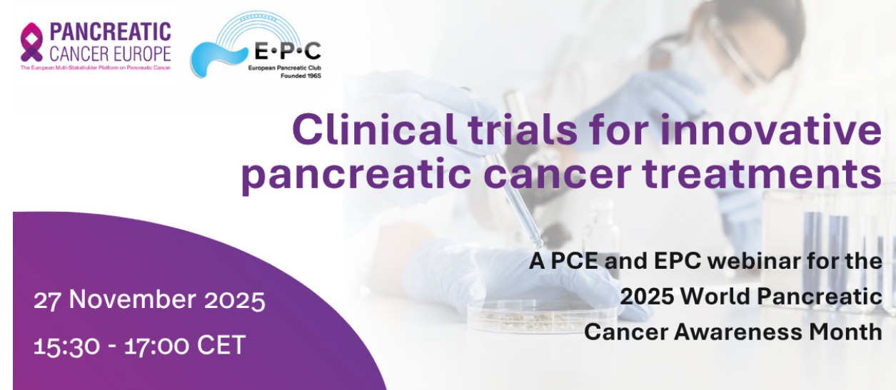 PCE, in collaboration with the European Pancreatic Club (EPC), invites you to join a special World Pancreatic Cancer Awareness Month webinar exploring the essential role of clinical trials in advancing treatment innovation and improving outcomes for people affected by pancreatic cancer. It will take place online on Thursday, 27 November 2025, from 15:30 to 17:00 CET.